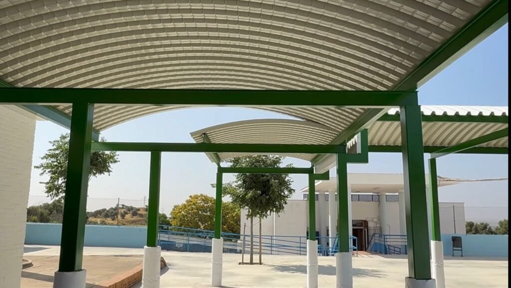La concejala de Obras, Ana Guillén, ha visitado el colegio Isabel Esquivel “donde recientemente han finalizado las obras de esta cubierta apergolada de chapa curva sobre pilares reforzados con cubiertas protectoras”.
